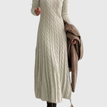 Luxus kábelkötött textúrával készült, ez a ruha gyönyörűen simul a testhez, miközben enyhe rugalmasságot és egész napos kényelmet biztosít. A hosszú, nőies sziluett meghosszabbítja az alakodat, és a puha anyag melegséget ad anélkül, hogy nehéz lenne — tökéletes a kényelmes pillanatokhoz, stílusos kiruccanásokhoz és minden egyébhez.